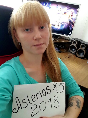 Игровой ник "ВалеринаДевочка (спойлик)обо мне, на проекте с 2011, играю по настроению, бывает несколько месяцев не выхожу из-за компа, а бывает не играю по пол года (знаю многим это знакомо)), но где бы я не играла всегда возвращаюсь на астериос ), в игре интересует только краб, играю я всегда спойлом, поэтому особо пвп меня не интересует, а вот как побыстрее и побольше заработать деньжат это прям моё ))) в реальности у меня 2е замечательных детей и муж, который и затащил меня в игру), а ещё моя любимая собака ) Всем хорошего настроения, пока ;))