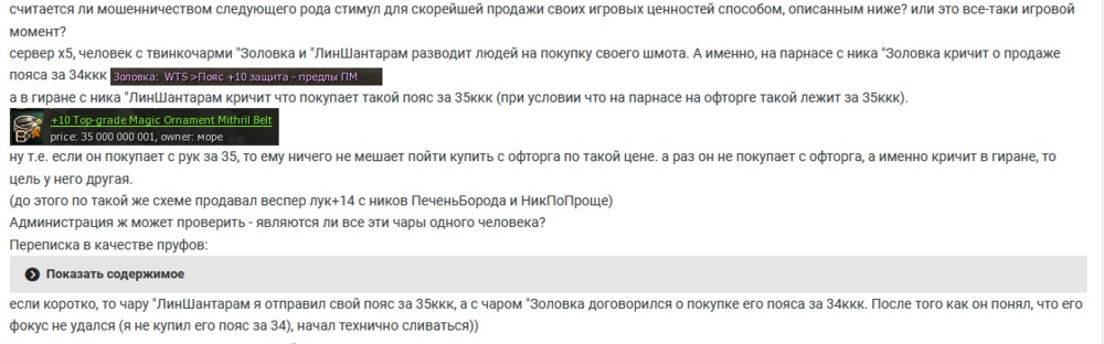 продолжение продать свой пояс, часть 2 ))) теперь наш предприимчивый продавец все тот же чар"Золовка (серв х5) решил повысить свой лвл впаривания! кричу я значит что обменяю свой +10й пояс на скил атаку. он мне предлагает с твинка "АйанамиРей якобы свой +12й топ пояс скил атаку поменять на два пояса +10 деф. и при этом одновременно с золовки предлагает мне купить его пояс. с АйанамиРей пишет что очень долго грузит "основу", видя что я при этом все равно не покупаю у его окна пояс, назначает встречу чтобы торгом передать и в торг конечно же ничего не перекладывает (потому что нету). ну а съехал вообще по дебильному. @GM-Kseniya, убедительная просьба - посмотрите пожалуйста, эти два чара являются одного человека. это ж чистой воды развод)) Переписку прилагаю) когда в торг показал ему два пояса хД в итоге дальше он просто замолк) в общем я хз, уже порядком он надоел, что каждому моему чару пытается впарить свой пояс.... ладно, я не ведусь, другие могут повестись) я не знаю какие еще доказательства нужны что это разводняк))