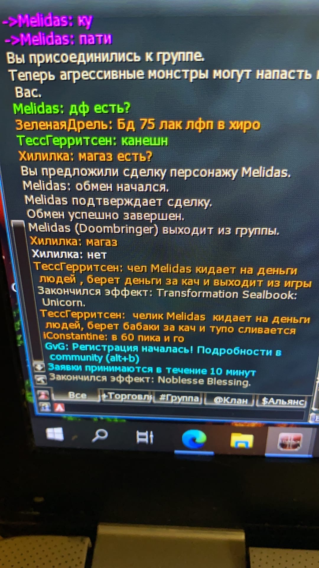 Кричал в гиране, что нужен кач. Ответил тип сказал что за 450 он качнет меня с 40 до 76 в рифте. Я договорился на 400кк т.к. у меня 63 лвл. Перезашел на твина, перекинул ему деньги, а он тупо взял и вышел из игры. Администраторы помогите пожалуйста, накажите и верните мою адену.