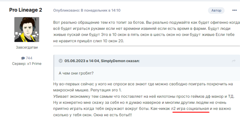 Давай попробуем. Бот - это любая автоматизация игрового процесса. Большинство кликеров это бот, который прожимает одну кнопку с определённой задержкой. Сам ты играешь в 10 окон, и активно используешь ботов, ты не наводишь мышкой на панель скилов, не жмёшь кнопку, не переключаешься на второе окно и тд, за тебя это делают настроенные боты при клике одной кнопки, т.е. у тебя боты настроены на много круче, чем у большинства макросников. Ты, вроде, занялся правильным делом, но чем больше читаешь твои сообщения, тем яснее понимаешь, что у тебя какая-то болезнь (без обид), у тебя сплошь и рядом одни противоречия: - Ты начал войну против ботов, но только против чужих, свои это "норм". - Ты заявляешь, что ла2 это про социальную игру, но сам окружил себя компами, лишь бы не взаимодействовать с другими игроками. - Ты со своими ботами фармишь в соа около 100-150кк в час, но при этом кричишь, что кликеры с выхлопом 5кк в час рушат экономику сервера. И это можно продолжать, но смысл? У тебя нет никакого критического мышления, ты не можешь адекватно посмотреть на ситуацию со стороны, тебе это игроки уже 10 раз писали, но ты в упор не видишь аргументов и фанатично гнёшь свою линию.