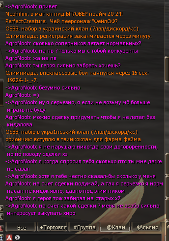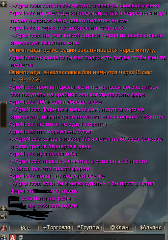 Какие талики, ты о чём ? Ведь ты сказал что мы теперь одна большая семья ! Пока лутал сп, эта обезьяна Алибард - САМ ПРИВЁЛ МОБОВ за что теперь будет казнён, я гарантирую. Ты сам виноват в произошедшем, мог-бы дальше сидеть и терпеть титул который висит над головой у спойлера который ты ВЧЕРА СИДЕЛ И ТЕРПЕЛ. Так что ты сам теперь виноват сынок. Мои действия, и действия моих людей которые со мной играют - это мои действия и действия людей с которыми я играю, но никак не клана в котором я нахожусь. Я ни в коем образе не собираюсь никогда подставлять, либо каким-либо ещё образом организовывать подлые действия по отношению ЛЮБОГО человека с которым я так или иначе соприкасаюсь, все люди которые знают меня скажут - что мои намерения всегда максимально чисты и открыты. Так вот ребятки, мы залетели 11 числа, смотрим, наблюдаем, думаем, обсуждаем что и как мы будем дальше делать, нет никаких конкретных идей по поводу того на чью сторону мы действительно встанем, либо будем просто устраивать беспредел - это только одному богу известно. Когда я играю в коллективе я придерживаюсь максимально демократичной системы которая в принципе своём базируется на доминирующем количестве голосов коллектива в сторону выбора того, либо иного действия. Чико, я недавно узнал как вы поступили с Назаром, так-что бога побоялся-бы вообще писать на форуме.