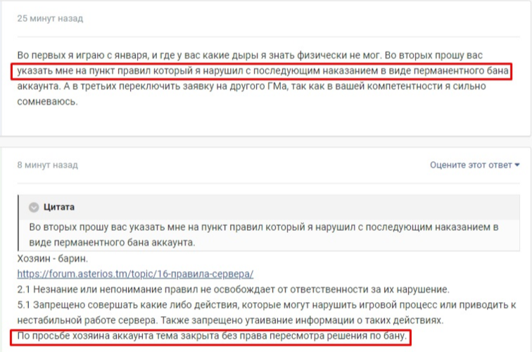 Всем привет! Поиграл я на астериосе с января до поза-позавчера, получил перманент при не очевидных обстоятельствах, в тщетных попытках оспорить - создал петицию, петицию решили через два дня переписки с Гмом, решили лишив меня права дискуссии. Я один считаю что формулировка не содержит просьбы УЖЕ забаненный аккаунт забанить еще раз? Мне интересно ваше мнение, выскажитесь пожалуйста, как бы вы поняли эти слова?