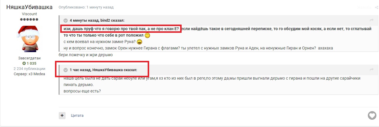 НяшкаУбивашкa Опубликовано 25 февраля, 2018 Автор Поделиться Опубликовано 25 февраля, 2018 Только что, bind2 сказал: ты сам сказал что гиран вам не нужен, но вы были на гиране. а так же вы были на Хейне. вам нужен аден и руна. но вы приходите на гиран и хейн п потом ты втираешь про ненужные замки. ну так и сидели бы на нужных. но тебе то поумничать захотелось ало идиот,мы были руна\аден\гиран\орен,больше мой пак не летал не куда,теперь мистер высосу из очка,кто вы? как ты любишь говорить "пруф будет что МЫ(т.е мой пак) был на хеине?" если нету,там можешь в гиране урины с пола слизать,я там поливал угов и небулу Ссылка на комментарий Поделиться на другие сайты Поделиться