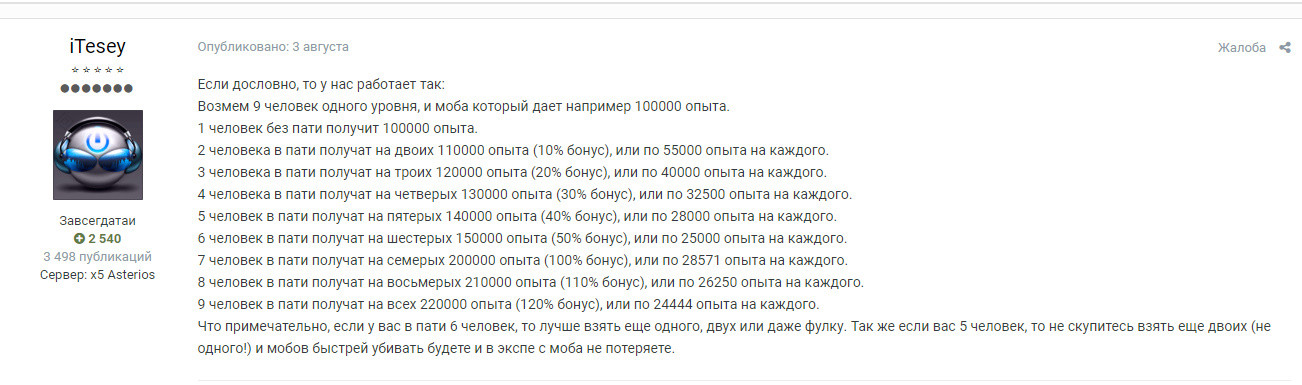 0 RikiTiki Опубликовано 23 августа, 2018 Поделиться Опубликовано 23 августа, 2018 1 час назад, GOLOVADRAKONA666 сказал: Добрый день соответствует данная таблица реалиям сервера ? Количество персонажей Бонус опыта в % 2 персонажа 10% 3 персонажа 20% 4 персонажа 30% 5 персонажей 40% 6 персонажей 50% 7 персонажей 100% 8 персонажей 110% 9 персонажей 120% ссылка на тему Скрытый текст https://forum.asterios.in/topic/493667-вопросы-по-новому-х7-faq/?page=4&tab=comments#comment-7807022 Ссылка на комментарий Поделиться на другие сайты Поделиться