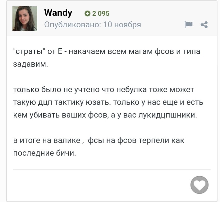 E1essar Опубликовано 19 декабря, 2018 Поделиться Опубликовано 19 декабря, 2018 4 минуты назад, Bindicam сказал: ты же знаешь где находится тема с предложениями, оформи предл, опиши где, как и почему должна быть боевая зона, тут то зачем ты про это ноешь уже не в первый раз? я про эту зону уже давно писал по теме фикс респа и давал примеры как она реализована на бабаяве , после чего на бае такую зону реализовали. так в чём у тебя проблемы продвинуть своё виденье? я смог донести идею до реализации на Бае , а ты можешь только тут словами кидаться? или всё же хватит ума и яиц заехать с предлом в НУЖНУЮ тему по адресу, а не сюда? все просто. Меня и так все устиаивает, пока всякие нытики не начинают опять пытаться переделать игру под себя создавая себе максимально тепличные условия. Поэтому на данный момент все что я пишу в политике про пвп зону перед заходками носит скорее риторический характер. Ссылка на комментарий Поделиться на другие сайты Поделиться