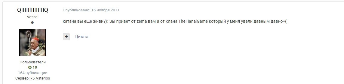 iNomeZerios Опубликовано 24 декабря, 2018 Поделиться Опубликовано 24 декабря, 2018 (изменено) Только что, FredTheRed сказал: норм Небула))С другим названием=)))и не тем Значком) Ты парень в глаза не долбись тоже а посмотри на скрины и ссылки. в 2010 году я был кл клана ThreeDaysGrace - но после того как 1 нехороший человек с ником РОМАШКА - не вернул мне клан , который я ему скинул так как уезжал на море. Вот в 2011 году я был уже в небуле на бише с ником QIIIIIIIIIIIIIIIIIIIIIQ Если что я 1990 г р Я не такой старый как пишут, 40 лет итд🤣 Изменено 24 декабря, 2018 пользователем iNomeZerios Ссылка на комментарий Поделиться на другие сайты Поделиться