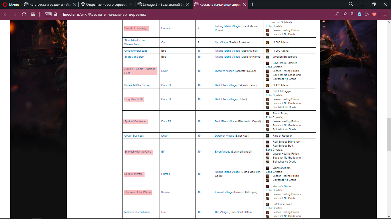 ydyta9 Опубликовано 23 августа, 2021 Поделиться Опубликовано 23 августа, 2021 19 минут назад, TwinTTex сказал: можно ссылку на такой квест? https://l2vika.ru/kvesty/quest-spirit-mirrors.html Вот пример, для каждой рассы свой квест, ищите в гугле Ссылка на комментарий Поделиться на другие сайты Поделиться