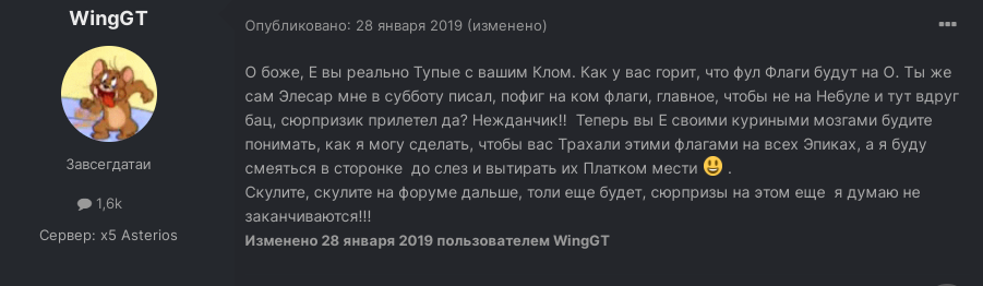 То есть клан должен забить на сражение с О,  на эпик,  чтобы бить какого-то Винга,  он же что-то написал на форуме)  Да и в принципе, зачем какой-то план,  вон талманес стоит,  а там ли купер,  а где-то ещё какое-то очередное тело с форума) Это важно...  наверное xD Детский сад)