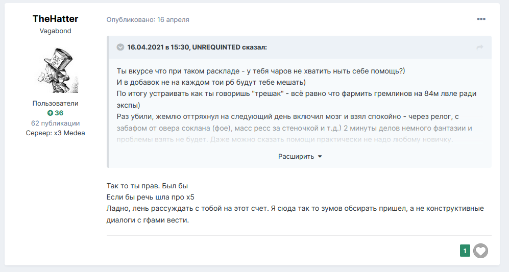 zany Опубликовано 19 ноября, 2021 Поделиться Опубликовано 19 ноября, 2021 5 минут назад, Kashchey сказал: Окей тогда отвечу так , убив мелкого / нейтрала / вара , ты ждёшь от него действий , глупо ожидать что он сможет тебя убить , но он может позвать на деф пупков , и ети пупки будут уже тебя убивать и заставлять думать и сами будут учится , что я вижу на деле , убивает наш 1 зумовца приходит 4 человека нормальных на 1 нашего, наш их убивает , толи скил сильный у нашего чувака, толи 4 раков а не пупков, соответствино вопрос , где Пупки зумов должны учится играть , в поле никого нет (кроме нас ) на гвг они не ходят , на кмах если посмотреть игру луков понимаеш что всем пофиг на то что нужно напрягаться и хотеть выиграть . П.с. Я не имею ничего против мелких , но я имею против большых которые не в состоянии что либо зделать , таким образом сервер мёртвый делается , вместо того что б по кд фармить и защищается драца помагать мелким они просто сливаются теперь история из жизни , качаю я чара в гц , пришол стрес убил меня и чара , я позвал на помочь , в итоге 2 часа где-то было пвп 2 на 2 , а я докачался до 80 лвла ) мораль сей баски такова нехочеш что-то делать , терпи Забей тактик , ты уже наговорил на месяц Ни 5 лет назад никто никого на помощь не звал, ни два, ни год назад. Максимум разовая акция на пару "помощей друга"(притом одного, максимум 2). Которую потом можно месяц вспоминать еще. А потом все как всегда. Я же же не уверен, что если ты сольешь какого-то зума на форте и и в гц он в КЧ пожалуется. Я слышал на Medea общепринято через 4 часа на другой форт регаться в этом случае. Скучно короч. Ссылка на комментарий Поделиться на другие сайты Поделиться