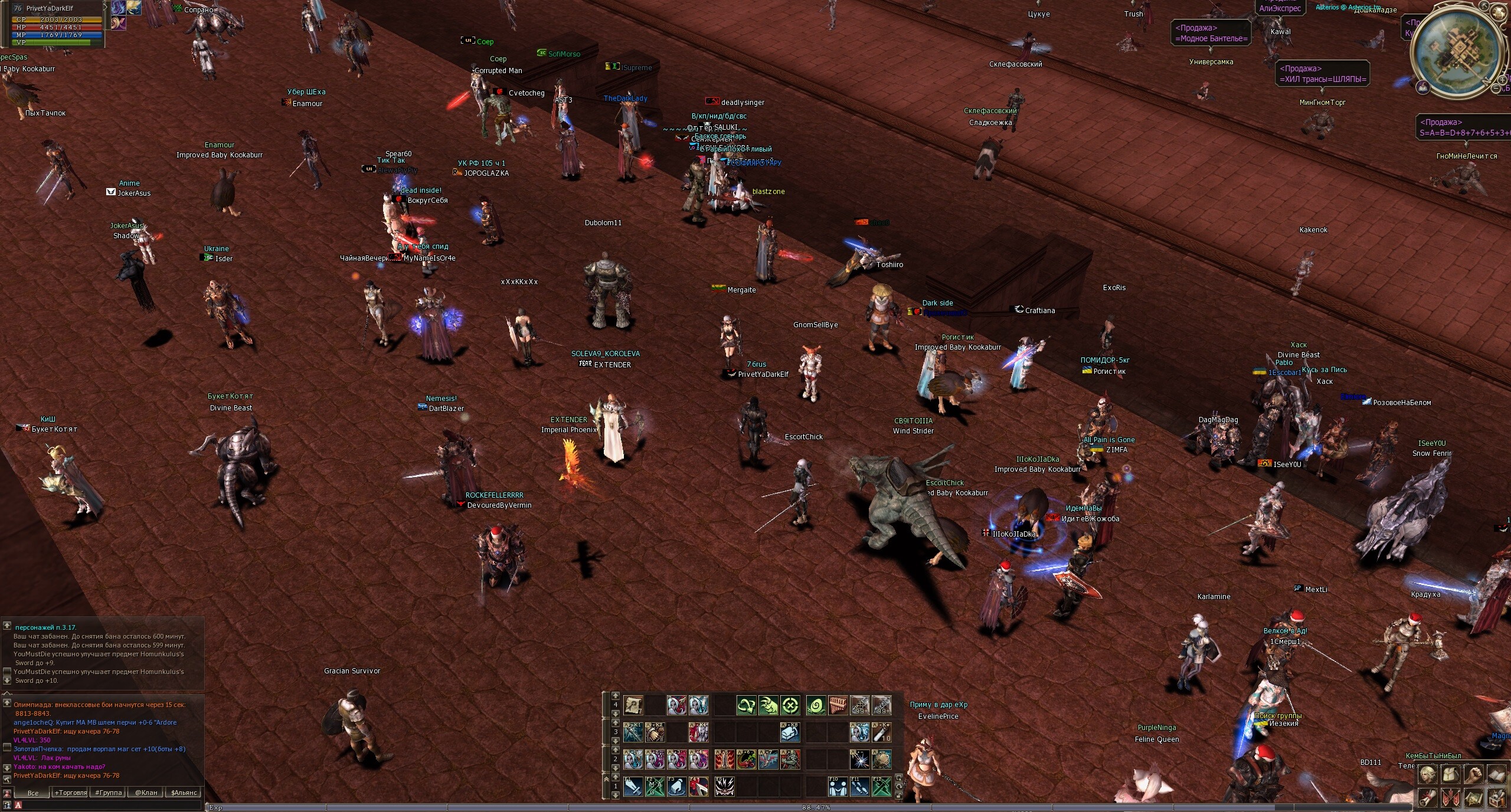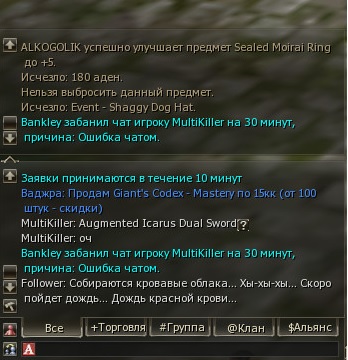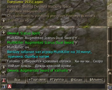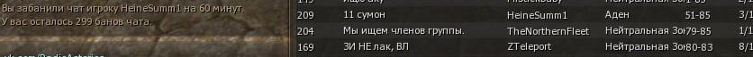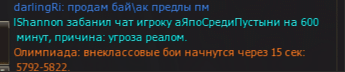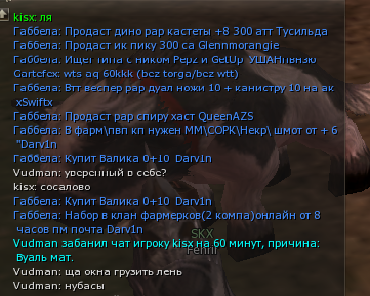 GM-Kseniya Опубликовано 4 сентября, 2022 Автор Поделиться Опубликовано 4 сентября, 2022 01.09.2022 в 10:46, DanielF сказал: Это не жалоба, а вопрос зашел в игру, а там стоит штука «Block All Chat”, никаких уведомлений за что это - не написано, и время не написано Скорее всего это бан чата по антиспам-системе. Он выдаётся автоматически, а не вручную. При попытке написать сообщение бан чата продлевается, о чём вас уведомляют в системном чате. В таких случаях нужно просто ничего не писать в чаты 1-2 часа. Или он снимается после рестарта. Просмотрите свои макросы на предмет флуда. Возможно, вам нужно увеличить временной интервал между ними. 20 часов назад, Ревизор сказал: Nagibala выдоло бан 600 мин персу VLasto4ka за покупку кача. А не много ли для 1 раза? Нормально. 0 Цитата Ссылка на комментарий Поделиться на другие сайты Поделиться