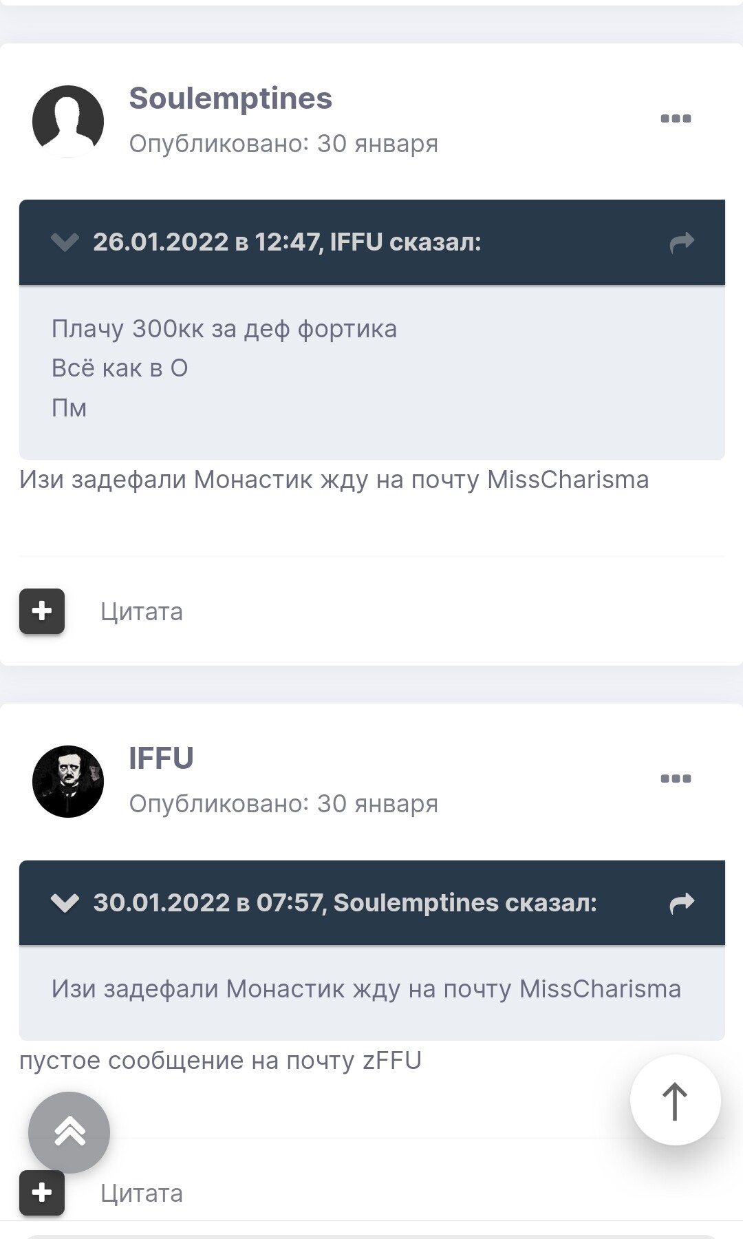 Talmanes Опубликовано 14 февраля, 2022 Поделиться Опубликовано 14 февраля, 2022 21 минуту назад, Exrell сказал: Если ты не понял что ето рофл то мне тебя жалко.Друг я в день фармлю по 5ккк минимум.Для меня форты ето новое развлечение,так как бить мобов надоело и 3 епик комплект уже впадло фармить Садистик предъявляет что-то другим за "продажность". Прейскурант ваших услуг мы увидели, даже если расплатились с вами валютой из Банка приколов. Слово-не воробей так сказать... Может в следующий раз начнёте обвинения с цитат/скринов? Мне кажется многие могут устать от пустого, ни чем не подкреплённого трёпа от вашего мобо-клана. Ссылка на комментарий Поделиться на другие сайты Поделиться