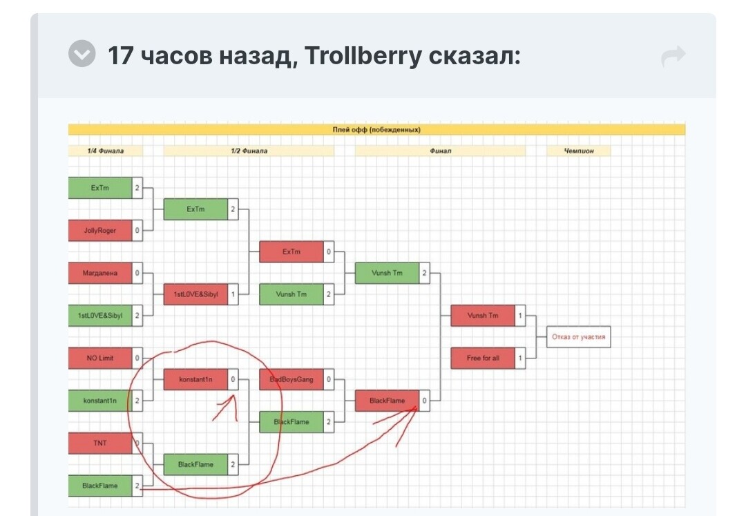 JIOМ Опубликовано 25 марта, 2022 Поделиться Опубликовано 25 марта, 2022 4 часа назад, Trollberry сказал: я не пересекался ни с Хартом, ни с Пролечиваю который потом подписался под словами Харта. и даже в ГВГ с ними не пересекались :) В посте ты пишешь что с Хартом в гвг не пересекался, на скрине ты пишешь что победил пак Коса, в котором Харт на Бише катал, получается Бинда Шрёдингера, то пересекалась то нет, Бинд красиво ты сам себя заправил, своим же дождем🥰 Ты там это смотри не захлебнись, а то кто ещё на форуме будет пруфами вертеть себе на лицо😒 Давай вставай там уже с колен, форум поднимать нужно, а то после пары побед Е, местные рупоры оправиться не могут, так ты у нас последний из Могикан, бери оборону на себя или в себя как ты там любишь, тебе виднее. 3 минуты назад, maxonmaxon сказал: Это мы сами не забираем, вклад по % сделалили как в банке, да и форум охота почитать. Это похвально, АО МММ ещё никто не отменял, но и деньги вернуть не все смогли. Рад за вас, буду держать в курсе вашего депозита в будущем🥲 Ссылка на комментарий Поделиться на другие сайты Поделиться