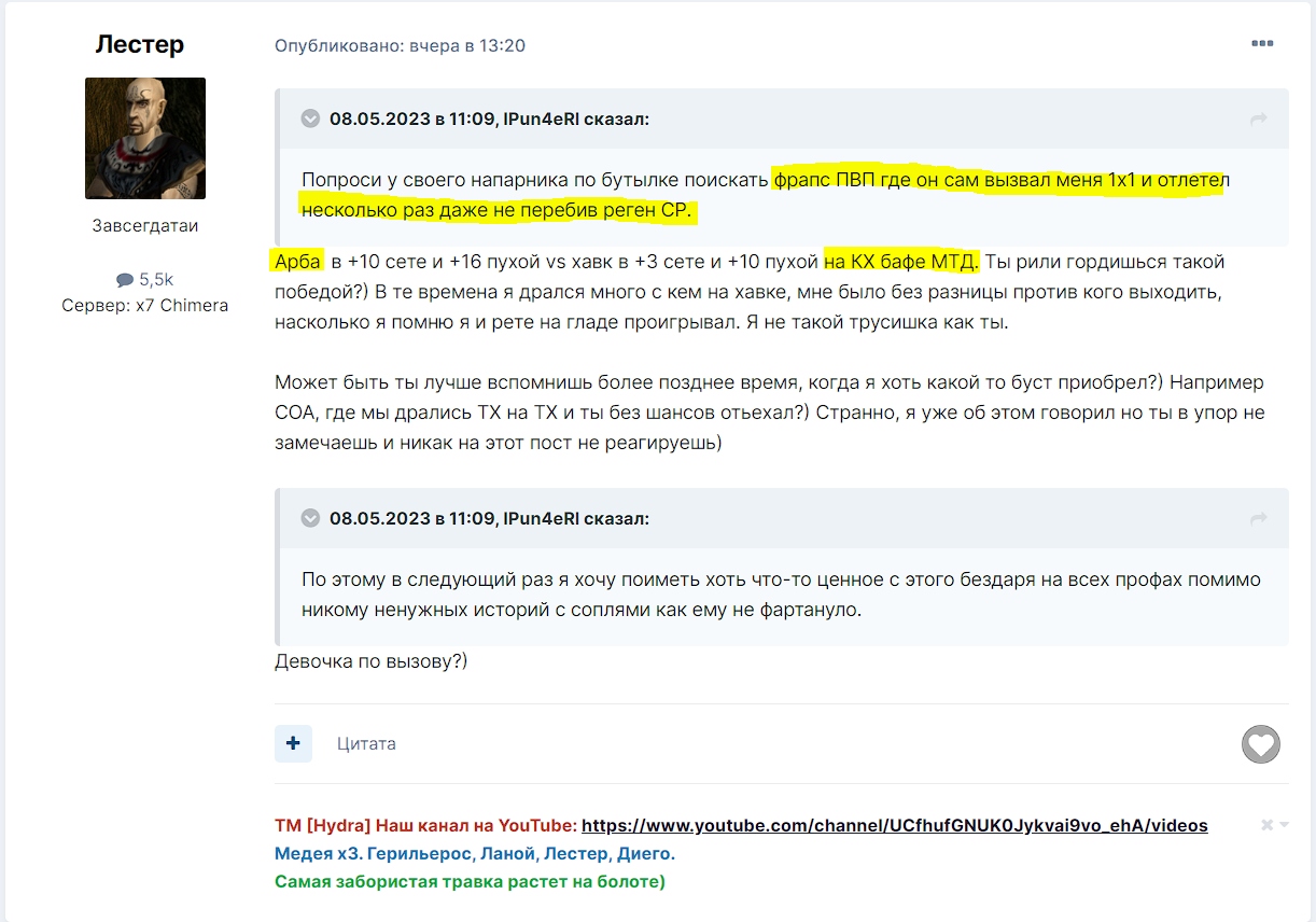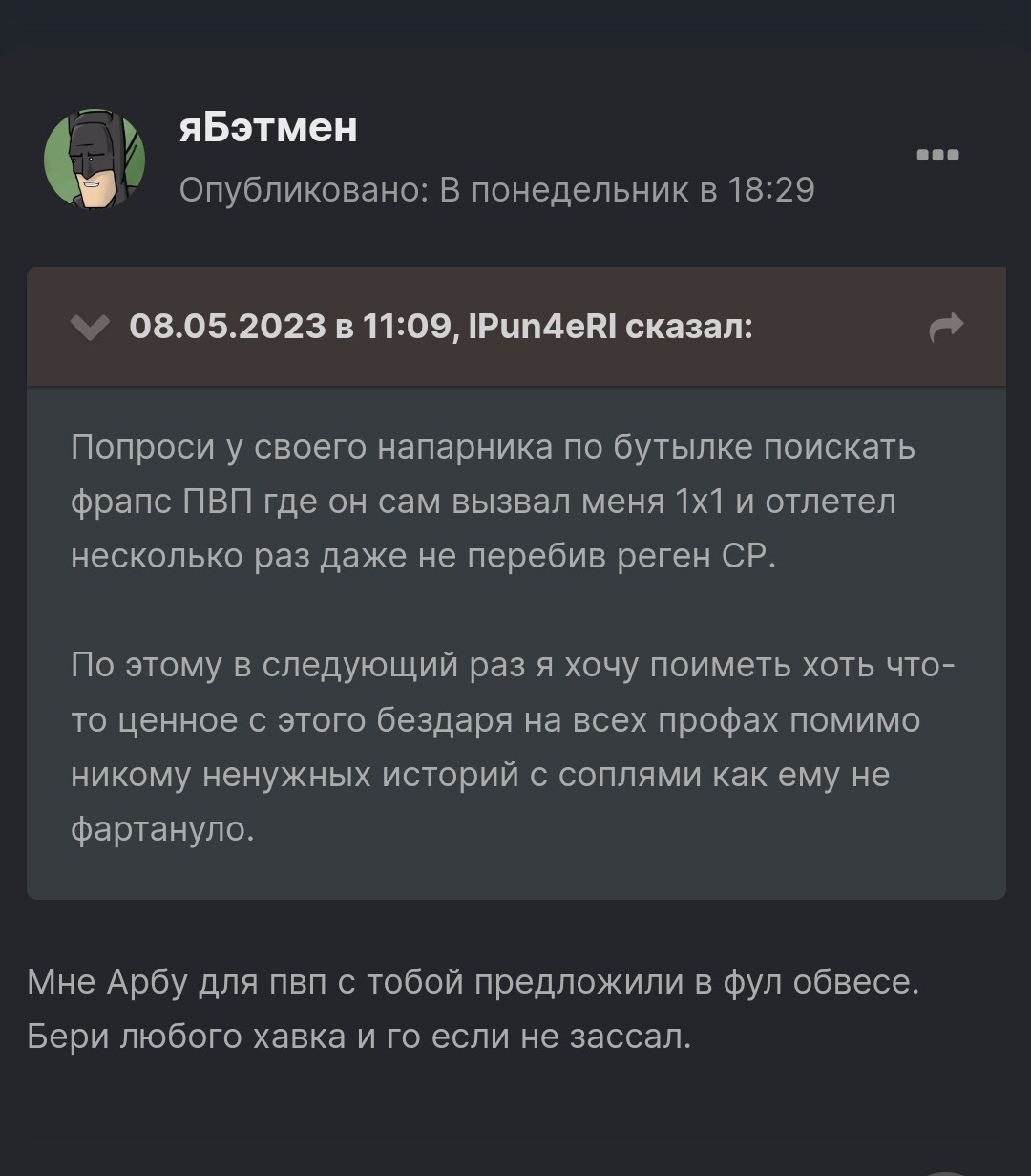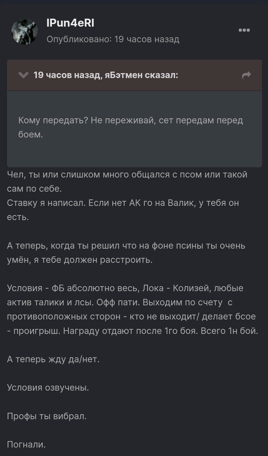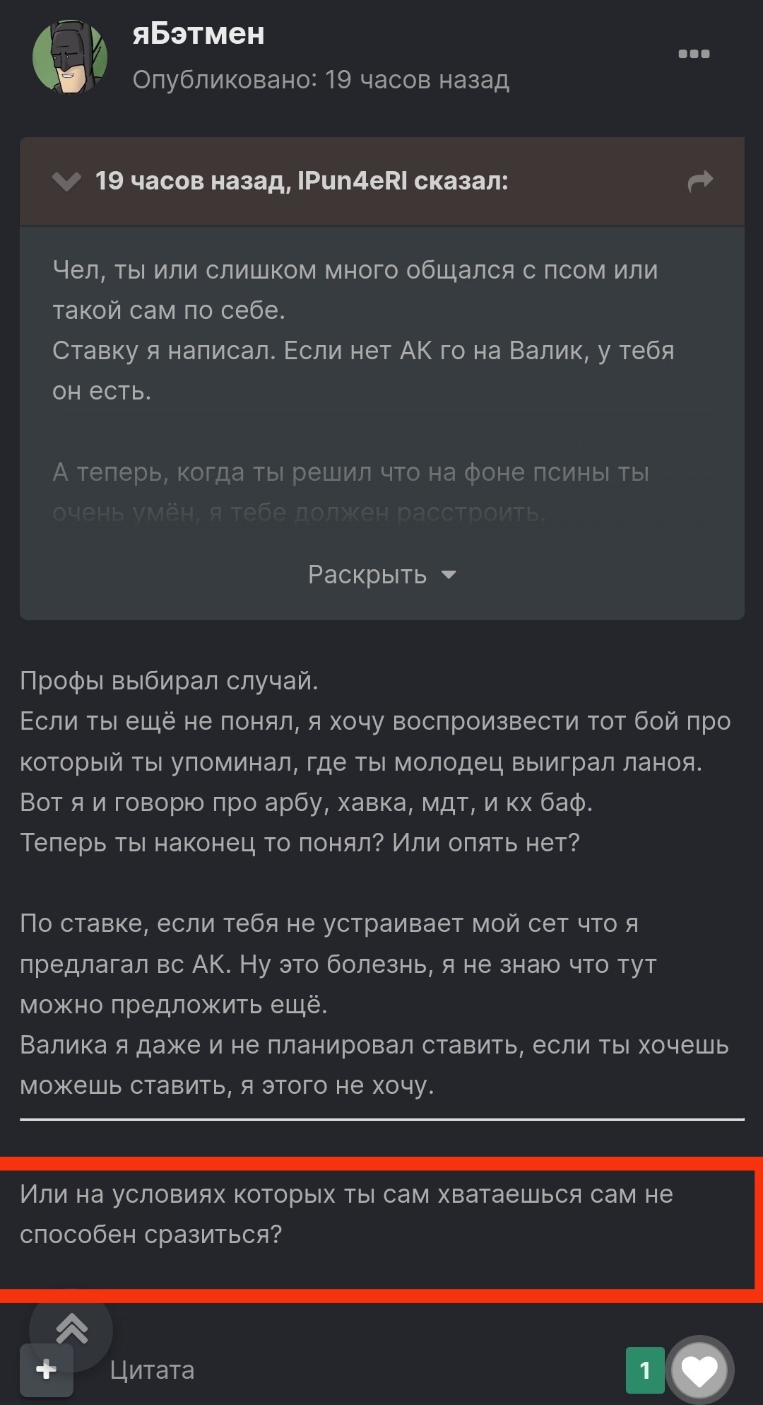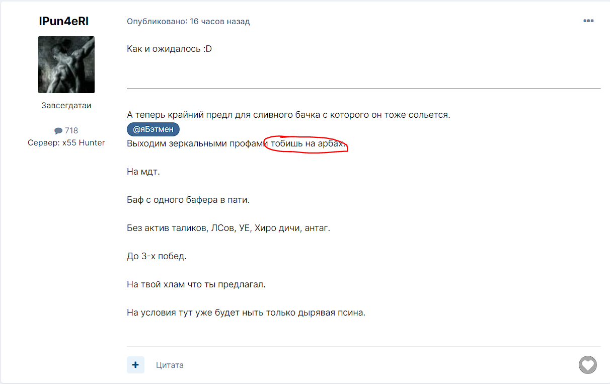 Я жду когда он уже напишет (через столько лет игры и того как ему наверное не один ДЦП на этом сервере объяснил элементарное) что буст о котором он писал в каждом сообщении там ничего и не решал как его оправдание о проигрыше. Или пускай отстоит свой базар на ставку в овербусте на хавке вс арба +3 сетик и +0 арбалет.