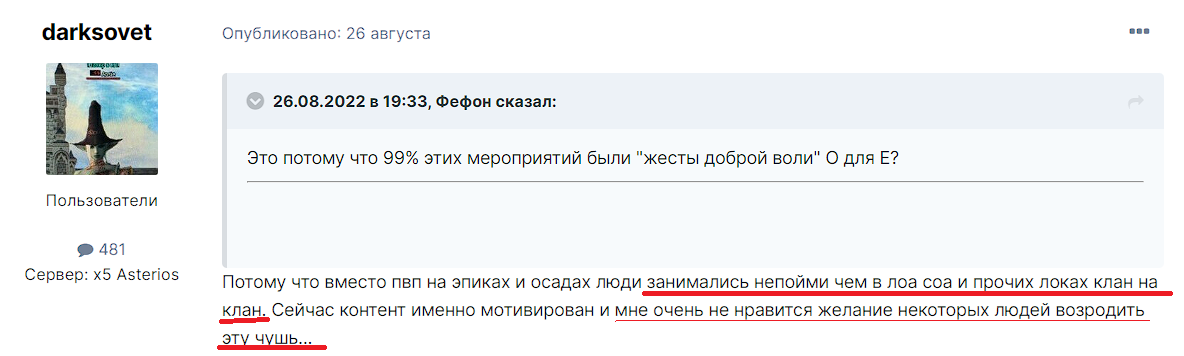 Ksardas57 Опубликовано 13 октября, 2022 Поделиться Опубликовано 13 октября, 2022 57 минут назад, ClintonBarton сказал: 2 клана+дод клан в одном алли против Е, ЕФ, ЕФ2, эта более менее равные составы относительно того, что есть сейчас. Или ты просте решил к словам докапаться и вывезти на этом? Я разве как то по другому посчитал? 1 клан = 110 людей, 2 клана = 220, 3 клана = 330. Я указал 200+, не 250, не 300, а 200 т.к это 2 клана + возможная подсосня отыгрывающая на додах в третьем клане. Или ты просто решил к словам докопаться и вывезти на этом? 1 час назад, Фефон сказал: Не переводи стрелки. Никто из вас так и не ответил на вопрос: 22 часа назад, Ksardas57 сказал: P.s А сколько драк было в поле пока были подняты вары (вне кмов)??? Мягкотелых уи и еф даже не спрашиваю, те вместе кнайтов фармят, тряпки. 21 час назад, Ksardas57 сказал: А на второй вопрос ответишь? Как часто ты дрался с триками или уи вне кмов при наличии вара (про заборов не пишу, т.к все знают где с ними можно подраться и вар для этого не нужен)? Возможно потому что ответ, нисколько. Тогда сразу появляется встречный вопрос, какой смысл в варе, если драк в поле нет. Сервер застойный, у тех кто больше года тут играет уже есть твинки для фарма и они в поле мейн пвп персонажем для фарма не выходят, в большинстве случаев. По этому система вара мертва. 1 час назад, Фефон сказал: А по поводу "бездарно" потраченного времени - ну так не качайся, ходи в Д шмоте, не качайся, чтоб заработать аденки и апдейтнуть шмот, и т.д. Ты сильно утрируешь, бездарно потраченное время потому что кроме как в пещере до кляйна и у сердца раз в 8 дней эти доды мусор. И то только до той поры, пока там есть драки. А что за риторика такая, что про олимп, что про прочую чепуху, "я делал так и вы делайте"? Это для того, что бы потом писать "они все слизали у е, это е придумали первые", вы так чсв свое поднимаете? 9 минут назад, Зять Одина сказал: Не стесняемся помогаем фюреру, осталось ещё 40 страниц +-, и на два месяца без доширака. +1 Ссылка на комментарий Поделиться на другие сайты Поделиться