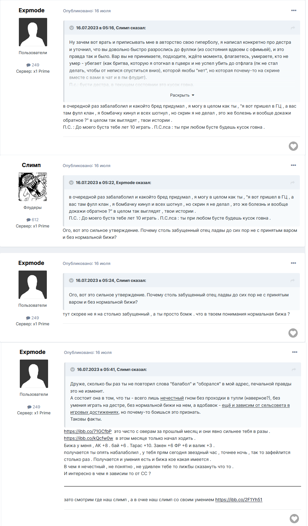 Слимп Опубликовано 12 сентября, 2023 Поделиться Опубликовано 12 сентября, 2023 22 минуты назад, UNBG сказал: Вы конечно же приложите скрины этого нытья или видео таких эпизодов? Говорите за себя. Возможно, у Вас и есть такие шуточки, кто знает.. О каких людях вы говорите, я, к сожалению, не знаю. И я правда - не знаю. Сейчас я Вами разговариваю, зачем ссылаться на не пойми кого? Кого, возможно, я даже не знаю. Какие-то левые факты из игры, которые меня совсем не касаются. Но я уверяю Вас на 100%, что вы никогда не приложите сюда скрины моего какого-либо нытья и просьб не ПКшить ))) Потому что мне проще забить на фарм и попробовать подраться, чем кого-то о чем-то просить и унижаться. В крайнем случае, разбившись 2-3 раза о стену сильного(ых) игрока(ов) - поменять место фарма или вообще заняться другими делами ))) Или бежать от кого-то куда-то далеко - приложите скрин или лучше видео (вы же любите доказывать), где я от Вас куда-то убегаю далеко ))) Максимум, я могу разорвать рендж, если по мне фокус идет, или конкретно Вы подбежали в упор на дебаф (такое часто бывало). Но то, о чем вы говорите - полнейший бред. И подтвердить свои слова вы никогда не сможете. Как это на вашем форумном языке называется - не подскажете? Но я не требую выкладывать скрины и видео, на самом деле. У Вас их все равно нет. Просто Вы так это любите, поэтому упомянул. Но вот попросить Вас не приплетать какие-то левые фантазии к моей личности, я бы хотел. Если есть факт - пожалуйста. Если нет, зачем? В очередной раз упасть в грязь лицом, выставив себя балоболом? Да пожалуйста. Заодно там есть скрин с крепы, по которой Вы кидали свои скрины, и это далеко не все. Скрытый текст Что с лицом? Будем усугублять положение? Ссылка на комментарий Поделиться на другие сайты Поделиться