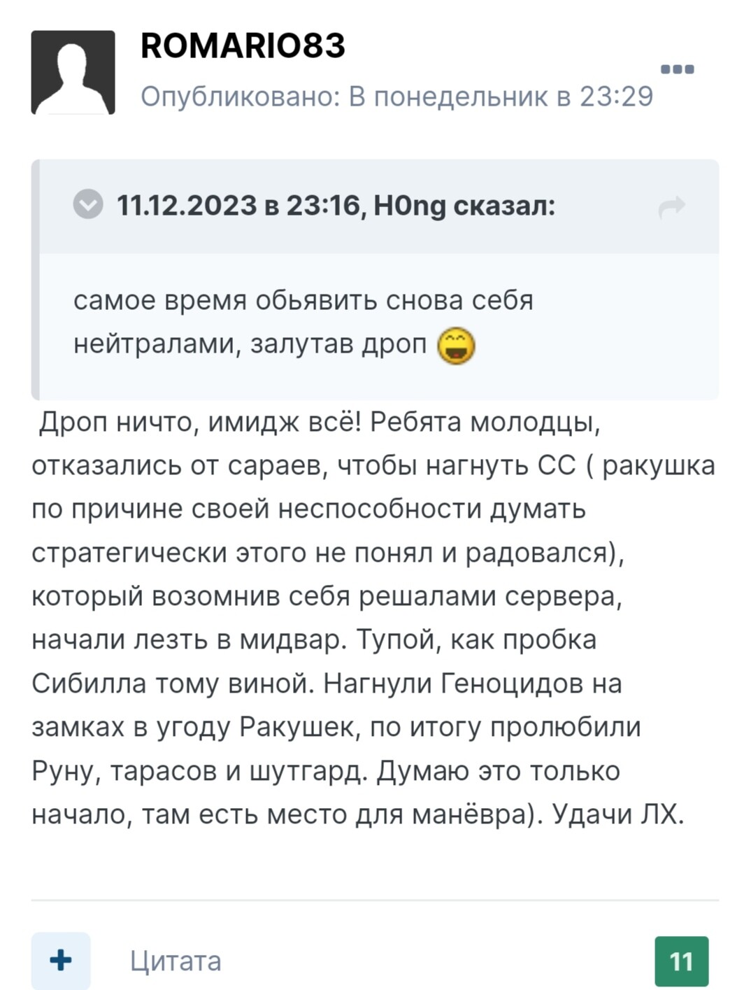 Ну, вообще было ожидаемо. Топ сайд на сервере подергали за усы последний месяц, они собрались. Это произошло в принципе на фоне того, что сентябрь-октябрь ничего не происходило и ребята расслабились. Что будет дальше время покажет, но вообще - надо в следующие Осады забирать у них Руну. А до этого, может и еще что получится забрать )