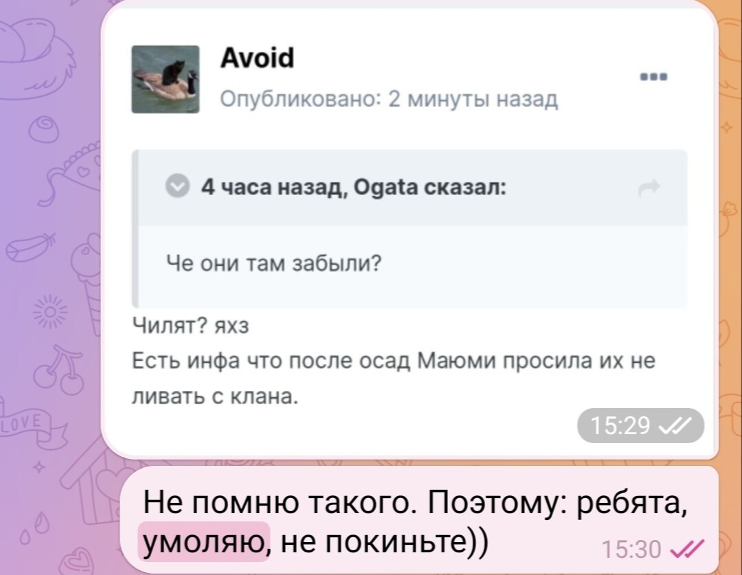 Красная панда Опубликовано 2 января, 2024 Поделиться Опубликовано 2 января, 2024 1 час назад, Snowdrop сказал: Вы тут совсем офигели? Закройте рот свой, бегунки по кланам. Я пришел в оппозиционный сайд в свое время, и много всего прошел в своем клане, с фига ли я должен куда-то уходить? А где неправда то? ТЫ говорил в интервью, что не согласен с политикой КЛ (засосов)! ТЫ говорил в интервью и на просторах форума, что не все текущие союзники тебе нравятся и многих бы ты хотел убивать! ТЕБЯ отборной руганью, с переходом на личности, кроет Генералов, тема тут не далеко, надеюсь не надо пересылать сюда его посты? Может быть ты и приходил в оппозицию, но уже месяцев восемь ты сидишь в теплице и лутаешь фрифарм. Бегунки по кланам? Это мы то, ушедшие с ЛХ, лутающего на фри фарме орфена, плюнув на то, что следующий был 100% наш? В том то и дело, пак ушёл, потому что были разногласия, а не сидел до последнего, как это делаешь ты. Только что, Маюми сказал: ))))) Все 60-е лвла видели её в пвп. Что с тобой сделали, что ты её выгораживаешь? У Амелии появился свой рыцарь? Хз, статистика говорит обратное. Факты. Челик в топ 10 пвп сервера, вас там никого нет, меня тоже. По этому рассказы про то, что его в пвп не видели, как минимум наглая такая инсинуация. Только что, Маюми сказал: Что с тобой сделали, что ты её выгораживаешь? Я за честность. Говорить, что Амелия слабый, как минимум ложь, всех вас тут он убьет, включая сноудропа. Лично мне, он ничего не сделал. Если говорить о трештоке, то тут всё на его совести, у вас есть причины его хейтить, но опять таки надо смотреть фактам в лицо. Генералов тоже трешит, но если с ним нормально общаться, вполне способен поддержать диалог. Так может быть всем нам учиться общаться? 3 Ссылка на комментарий Поделиться на другие сайты Поделиться