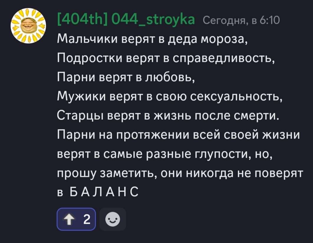 ЛюбимаяИзуна Опубликовано 7 января, 2024 Поделиться Опубликовано 7 января, 2024 4 часа назад, фонАйнцберн сказал: есть личные отношения, а есть общие. Так вот когда человек добр к своим друзьям, а на самом деле является той ещё гнилью, это просто означает, что если твой друг гниль, то и ты - гниль. Скажи кто твой друг и я скажу кто ты. Это видно по твоей манере игры и общению, это видно по тому, что ты человека дефаешь постоянно, а за его недостатки (зашквары) умалчиваешь, а ведь они есть у каждого. Ты вообще знаешь предысторию, почему мы с ним посрались? А ты узнай, только не от Чико. Нет? Так вот одна из причин - он подлизывал олимперам х5 в оли теме х5, играя на х7 настолько, что влез в разговор и начал впаривать, какой же он богатый, когда там всем стадом мне говорили, что я живу в будке и я бомжара (прошлый мой видос надеюсь всех протрезвил, где оказалось, что я вообще шейх в 2023ем, но да, был бедным студентом в 2015, а спор состоялся в 2022ом, притом не я выделывался, я себя дефал от тех, кто по приколу принижал достоинство и твой Чико за возможного светлячка выбрал сторону...3:15 статка где 3 это победы, кто-то сделал фарм профы и к успеху шёл), потом просто присоединился к хейту и мы до этого вообще не общались. Ничего бы не было, мы бы с ним возможно и общались хорошо, если бы не язык меж булок Е. Причем это не помогло, ну никак Ну ладно.. бывает. Мол Чика 69, таких много везде, как бы оно просто дым, а огня нет, но тут я чисто реально случайно захожу на форум х7 и наблюдаю, как он втихаря про меня распускает слухи и люди даже не понимают, кто я такой и о ком он постоянно жужжит. Я его за ухо взял, а он как давай верещать, бегать за мной по всем темам, высираться в разделе рекрутинга, продаж (на счёт рекрутинга, лол) и прочего. До сих пор нет извинений. Почему? А я его поймал на горячем и это ему не понравилось. Ведь как так, (да он писал, что заходит на форум чисто меня тролить, ваще не играя в л2, открыто причем), ты о человеке трепишься за глаза, выдумываешь всякий треш, полагая что тебе поверят (ну ты же свой типо, да и команда на форуме в лице того же Рича имеется, если что), а гадкий Изуна это все видит и ещё сопротивляется Говорит что все небылицы про 3 боя вместо 4, что нг дагером в нг меня валял, когда я не играл, про буст тыкая в пуху, забывая о биже.. про баф, который вообще с таймингами пвп не сходится, можно продолжать до бесконечности Про то что он долларовый миллионер, причем ссал в уши всем своим 69 друзьям в мамбл, Толям всяким, про его гайды, "которые он не знает, потому что по своему же гайду не играет", про его олимп заливы и ржавые сетики, которые он же сам на форуме писал "а чё такого", про его скам подписоты на стримах (пусть это будет пока что на уровне слухов)... Куда больше шкварится? А что ты мне например можешь предъявить? За топор в 2015 по слухам, которые я сам же и подтвердил для контента?, и что ещё, а ну...про успешный залив? Против залива?) Причем этот залив никак не повлиял на мою игру, заходи на х5, покачаю тебя по полу, похаваешь пыль. Или куда там твой буст сессионная хрюшка вечно давается, что ты сколько сезонов в мид/биг варе трешься, а на х5 у тебя после слияния в инвентаре перекатиполе ты кстати на него похожий. Стоило только тебя поправить за ДХ, так ты на луну улетел, купаться там в своей желчи. вполне возможно это ссаки. Ричдолка, которая вполне себе могла слиться в чс, ибо не вывозит 