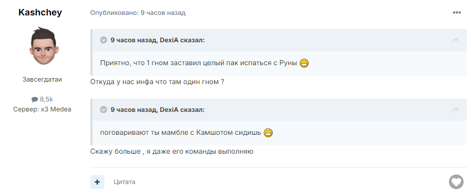 Barzometr Опубликовано 2 сентября, 2024 Поделиться Опубликовано 2 сентября, 2024 (изменено) 2 минуты назад, Kashchey сказал: Зерг гламуров ! Ответ хороший, но не по теме В районе 10 паков против 5, кто зло? Я прекрасно понимаю ситуацию, просто хочу чтобы эту КАРАТЕЛЬНУЮ ЭКСПЕДИЦИЮ ОБИЖЕННЫХ наконец-то осознали как ЗЕРГ, который тупо отвечает злом на зло Чего вы добиваетесь? Люм понятно, там помешательство, слива - развал гламуров, ты - месть гламурам, но что все это в итоге даёт сейчас и даст в будущем? Опять долбанное болото? Или один новый в истории серва зергач сидящий на всех драконах? Изменено 2 сентября, 2024 пользователем Barzometr 0 Цитата Ссылка на комментарий Поделиться на другие сайты Поделиться