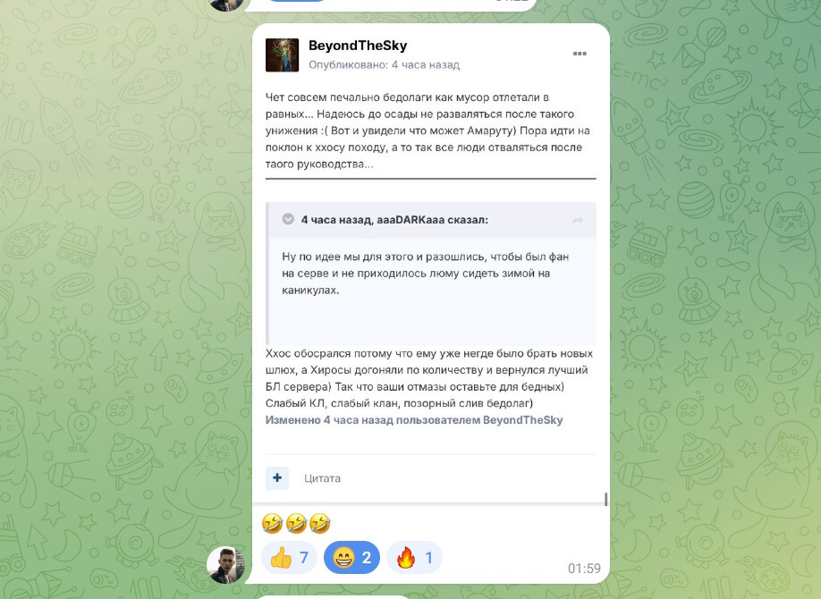 BeyondTheSky Опубликовано 7 апреля Поделиться Опубликовано 7 апреля (изменено) 21 minutes ago, tatakae said: почему ты пишешь хиросы а не например групировка? почему когда на эпик ведешь клан ты он похож как цц на закена и убивается с двух плевков. а когда ведет ельфид клан начинает резко играть. Я это к тому что какая разница что ты пишешь? на игру хиросов это не влияет пиши просто график игры ельфида и все. Ну вот, ноунейм снова лишь показал, что ничего не отстреливает в происходящем на сервере :) Как же горит у бедолаги что и под моим руководством Хиросы спокойно разваливали ГО в равных, и даже в меньшинстве, пруф чего ты и постишь :) On 9/4/2024 at 10:45 PM, Отец Понимания said: Вот тебе график Эльфида как ты просил)) Изменено 7 апреля пользователем BeyondTheSky 0 Цитата Ссылка на комментарий Поделиться на другие сайты Поделиться