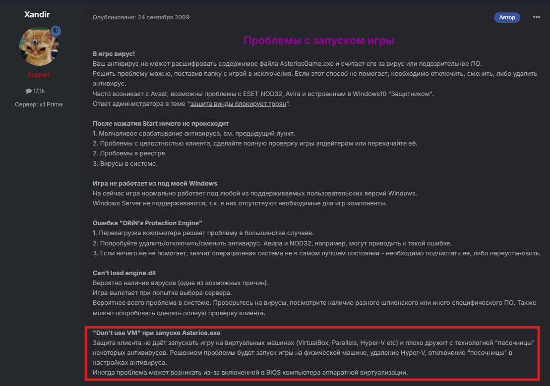 MuRRaiN Опубликовано 31 июля Поделиться Опубликовано 31 июля 1 час назад, crew сказал: так тут проблема в 11 винде а точнее в конкретном обновлении. Если у вас на 10 не работает то вероятно проблема в чем то еще. Ты думаешь он не посмотрел в название темы? Думаешь что он на столько туп что-бы не отличить "лезть в биос и будет работать" и "ничего не сделать ибо проблема клиента, пока админ не сделает не заработает"... В целом хз в чем смысл его поста конечно, надавить на жалость? Из-за проблемы которая его не коснулась? А так, если в биосе, на сколько я помню, там только виртуализация может мешать клиенту, и это всегда было табу на астероисе 1 Цитата Ссылка на комментарий Поделиться на другие сайты Поделиться