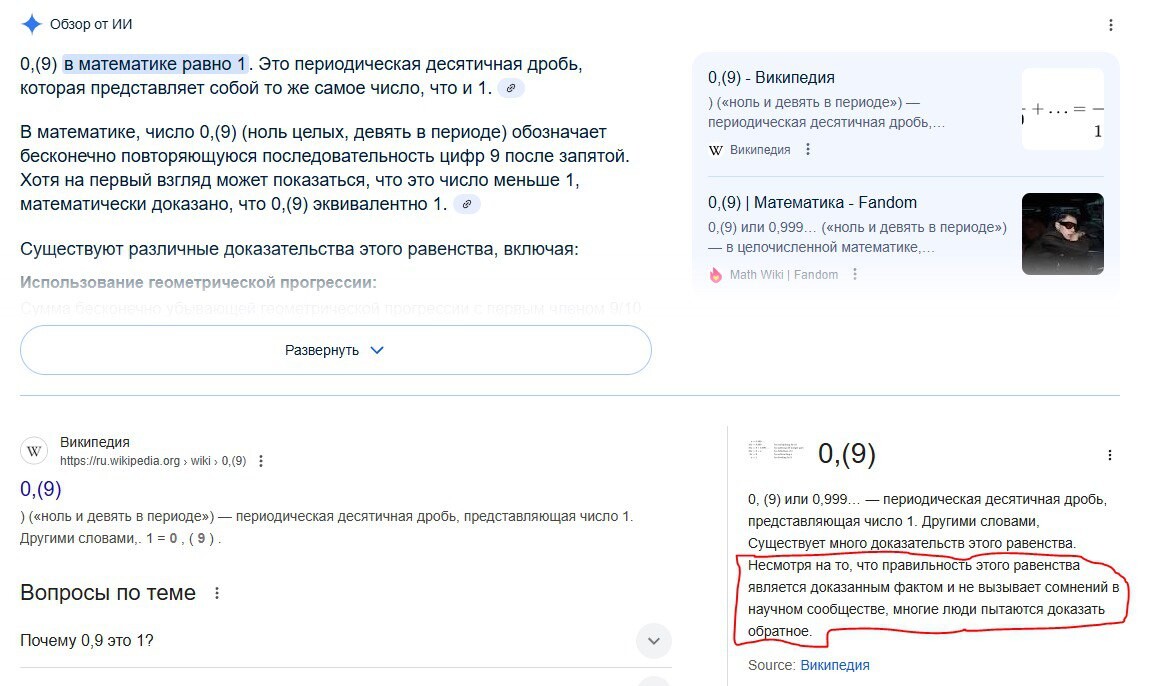 Ну, согласно  теореме о бесконечных обезьянах - действительно, вероятность ненулевая. Но так далеко, боюсь, заходить не стоит, учитывая, что тут народ не знает о периодических дробях, и ты пишешь, что 0,(9) это стремление к 1 а не 1 -.-